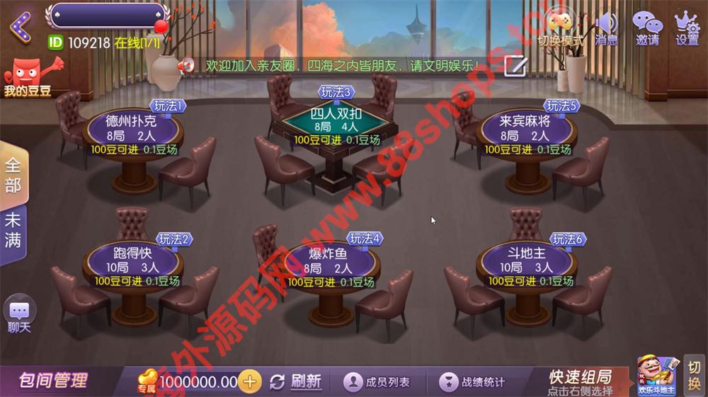 内含游戏:炸金花、德州扑克、十六张跑得快、十三水、四人双扣、耒阳鬼麻将、衡阳鬼麻将、衡阳红中麻将、衡阳六胡抢、衡阳二五八、衡阳十胡卡、耒阳字牌、祁东十五胡、柳州麻将、柳州字牌、来宾麻将、祁东六胡抢、六人三公、八人牛牛、欢乐斗地主