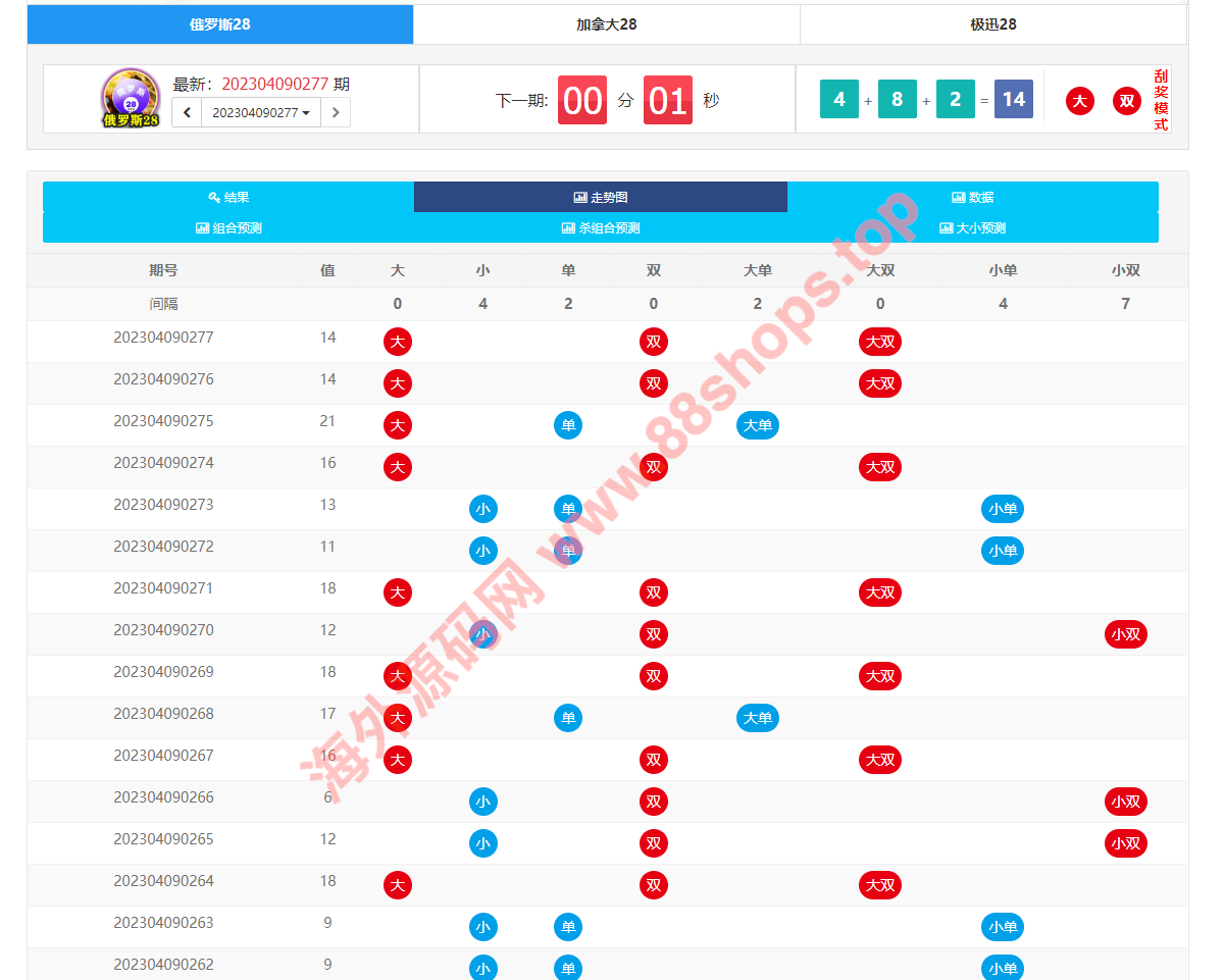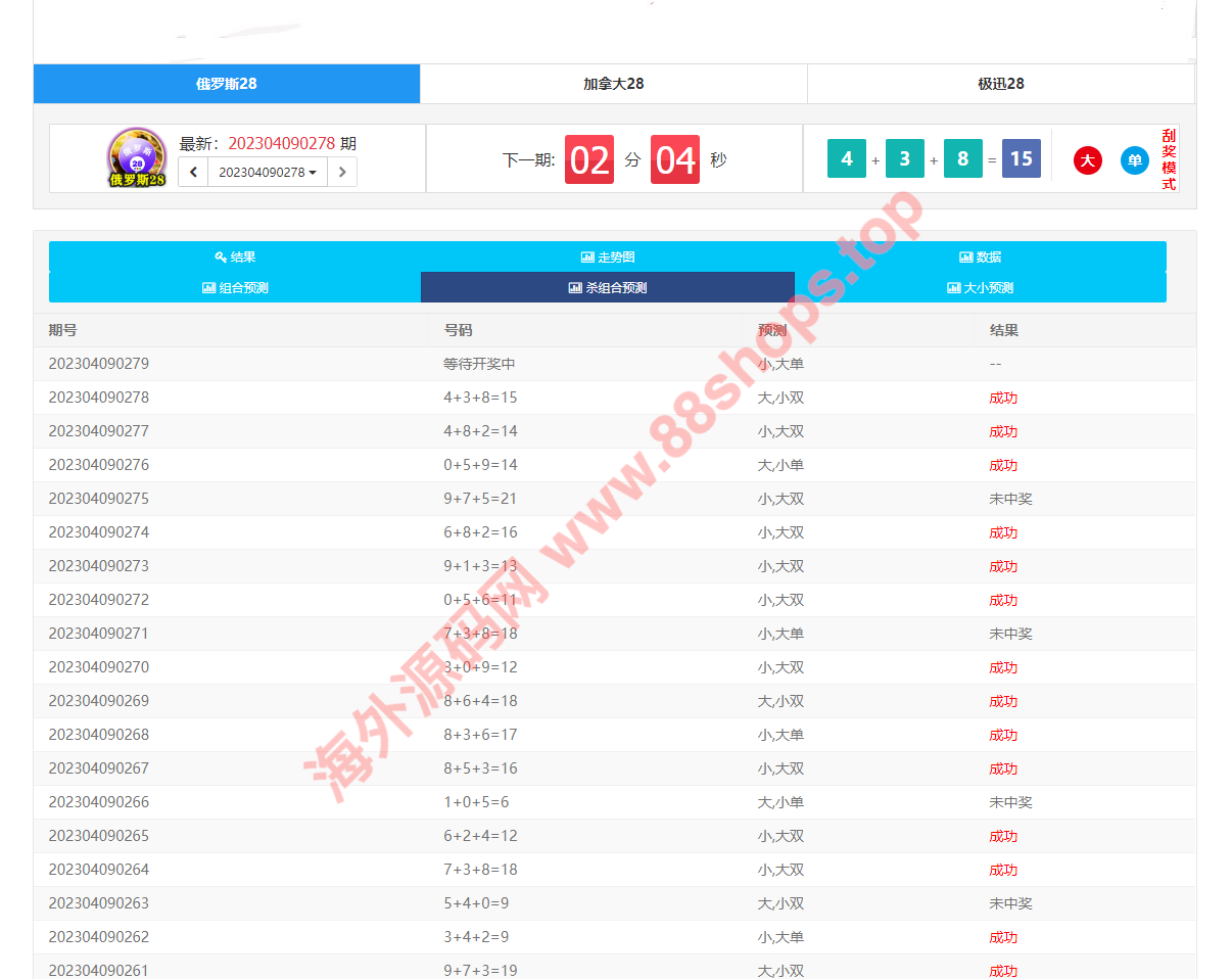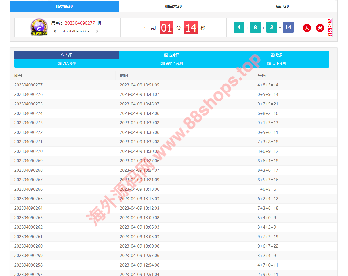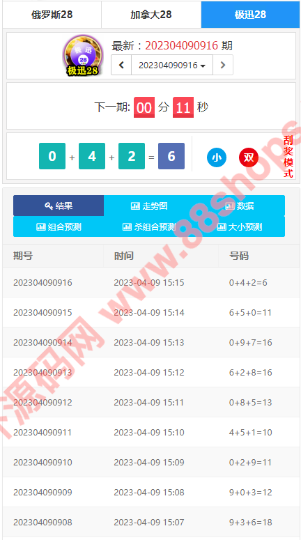 彩种有:俄罗斯28、加拿大28,极速28,也可以二次开发添加更多彩种,可以提前预设开奖结果和修改开奖结果
