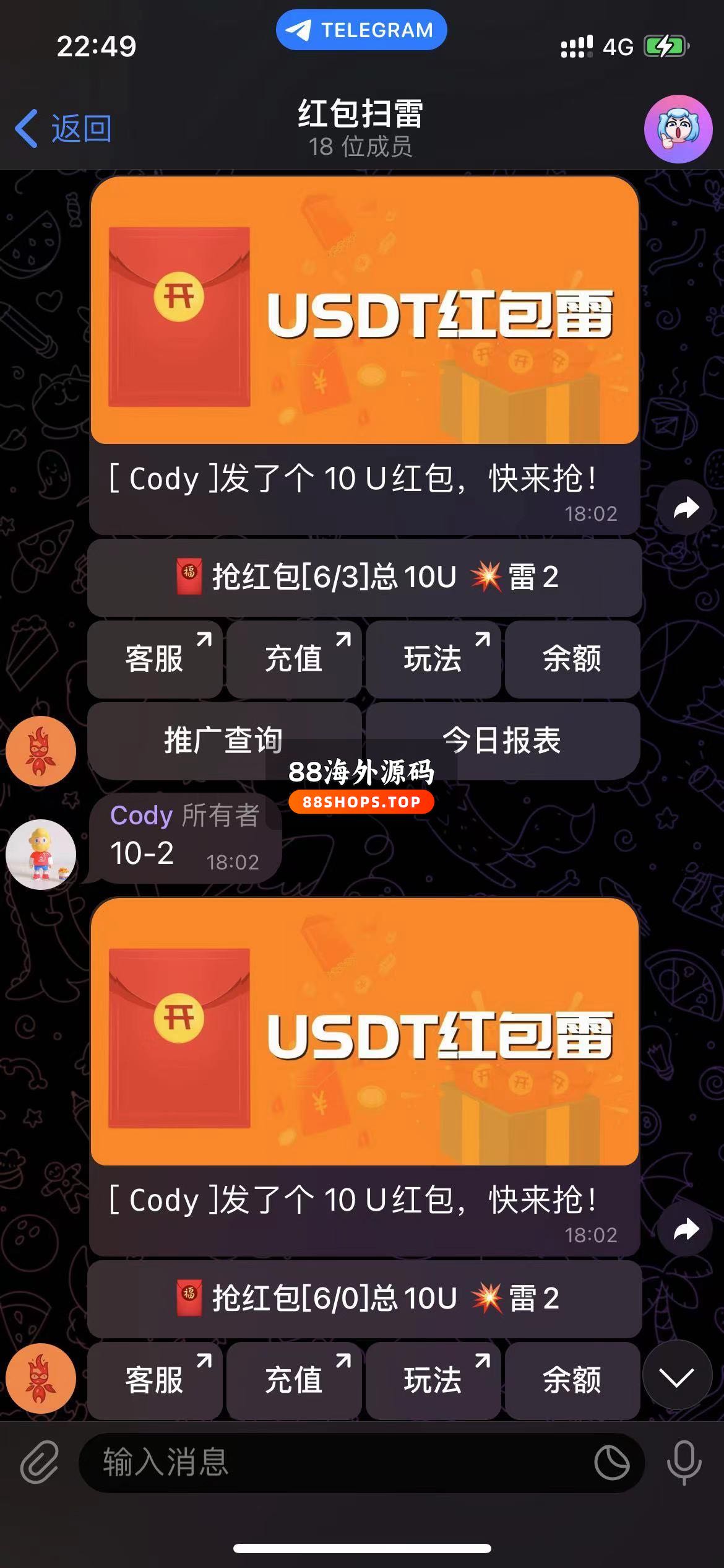 发包玩家发包的格式为:发+金额+雷号 比如要发50U雷号设置为4则直接在娱乐群中发送 :发50-4 注意:发包时 发包玩家账户余额必须要大于要发的金额