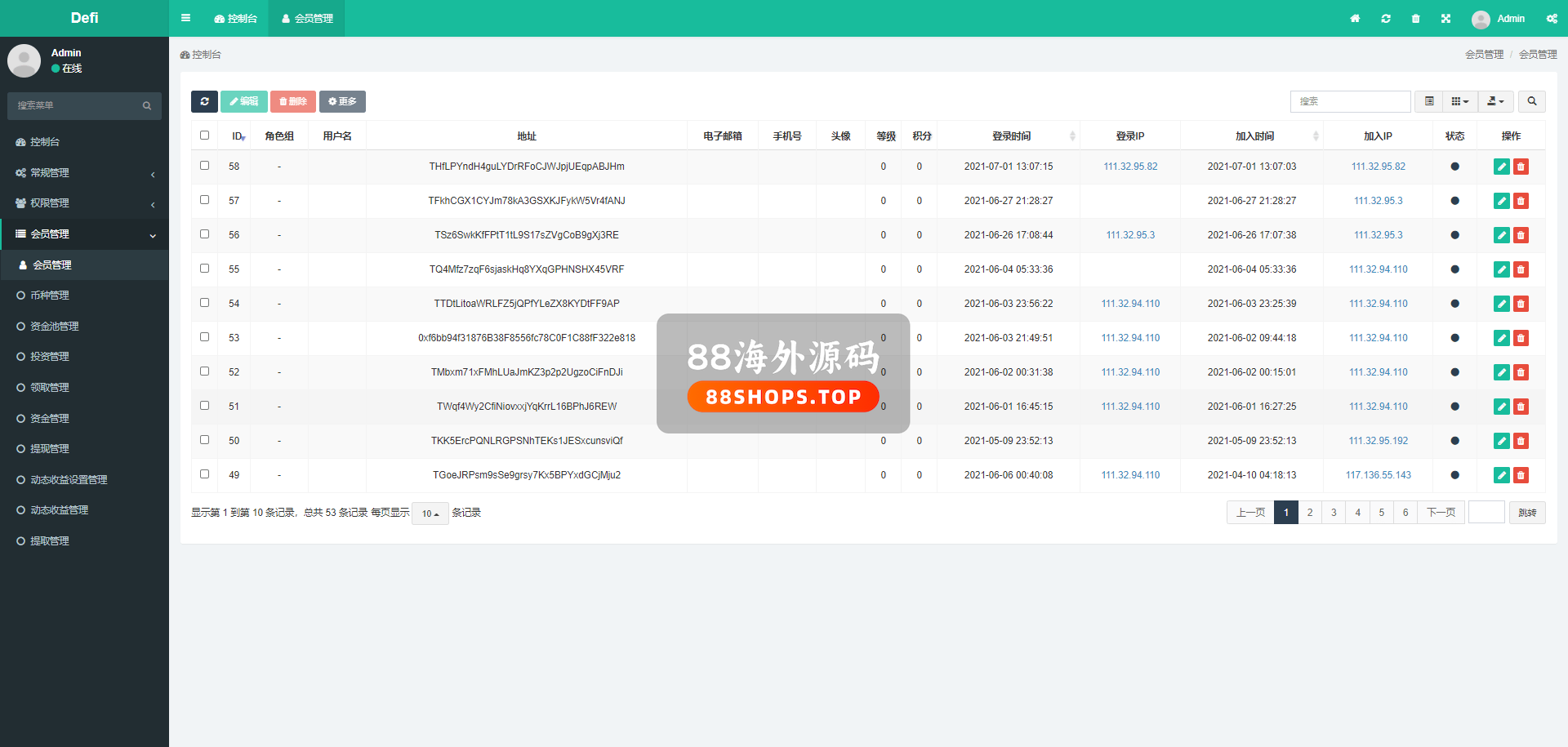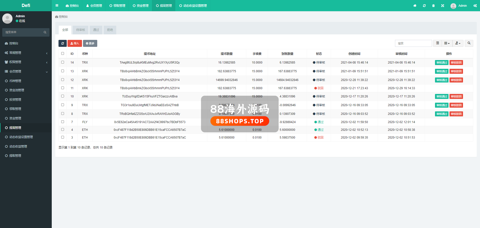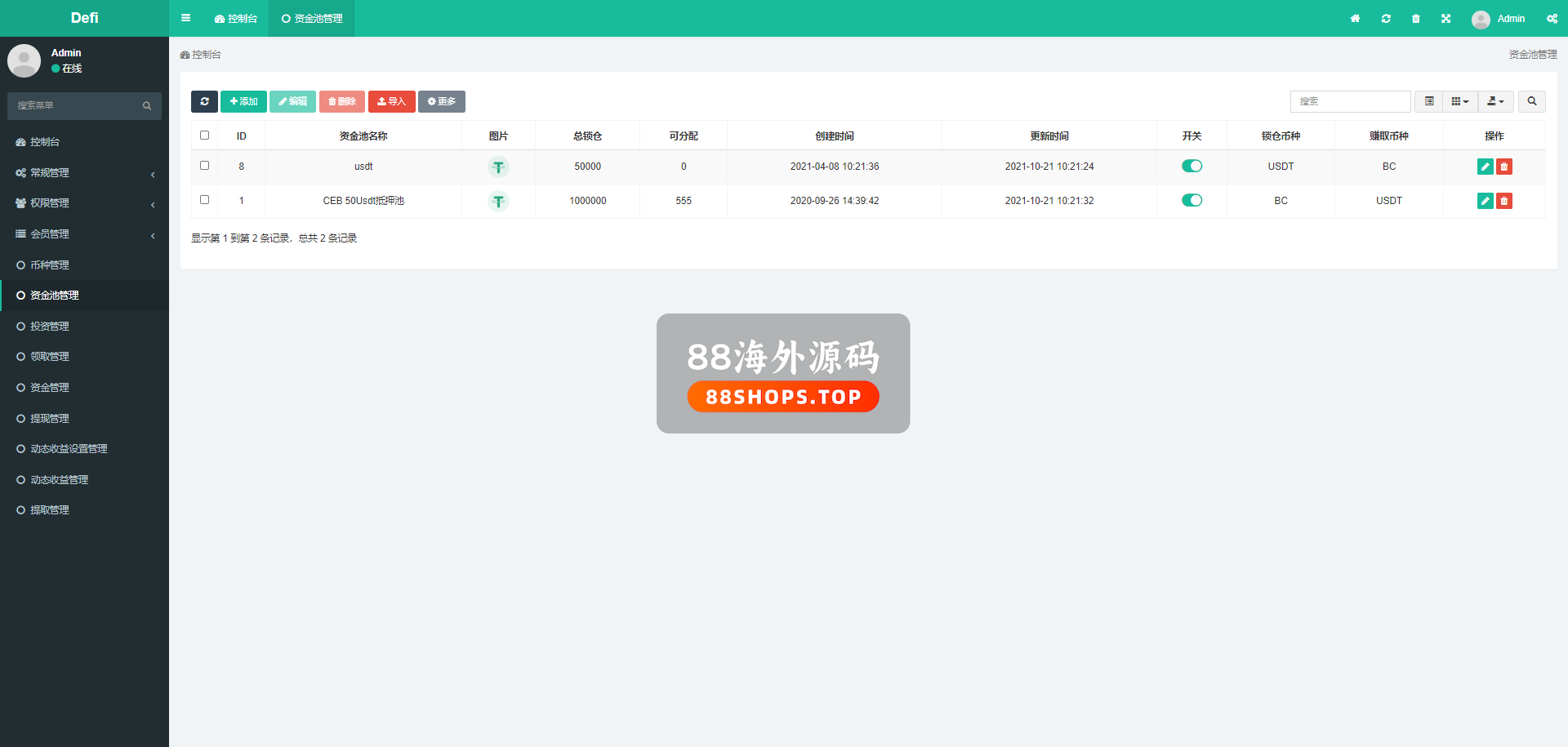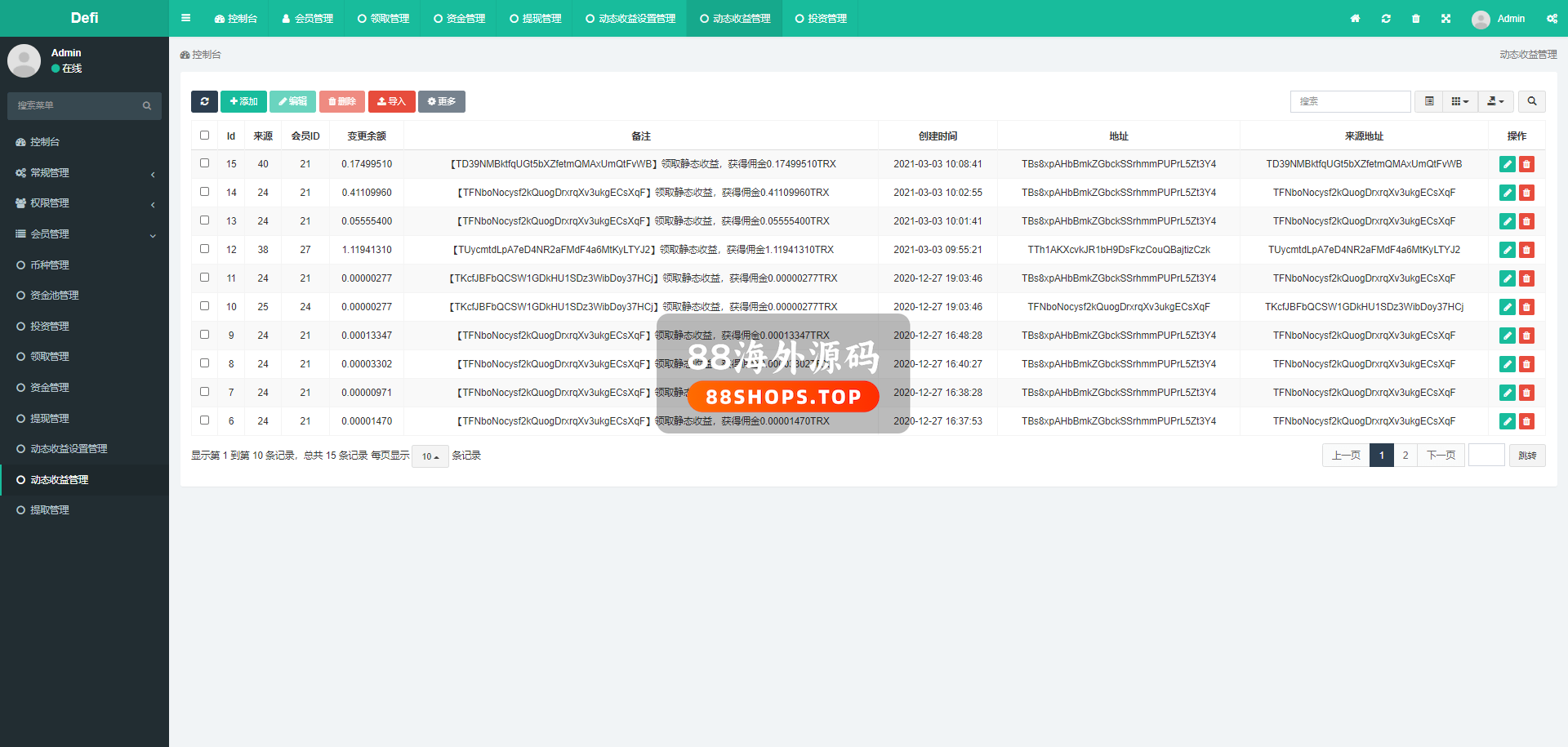 后台可以设定质押天数、收益、转入币种、转入数量(转入数量是固定的,比如设定10个TRX,那么用户必须投资10TRX进来。