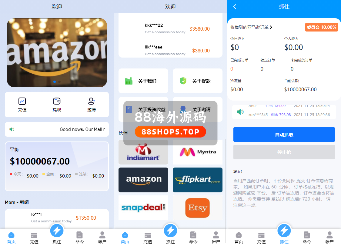 西班牙,英文,巴西,中文,德国,拉法兰西,荷兰,缅甸,Sverige,日本,Türkiye,ประเทศไทย,भारत,Italia,Indonesia,Việt Nam 2.源码是开源,无加密,无后门(支持任何二开功能) 3.优化手机端页面,解决手机端加载慢的问题 4.可封装APP(如需要封装app,联系QQ客服咨询) 5.邀请功能-可自建团队,获得更多佣金,升级会员等 6.对接好支付宝支付接口,Globl·pay支付接口 7.自动抓取亚马逊订单,可以停止抢订单-抓取订单做任务
