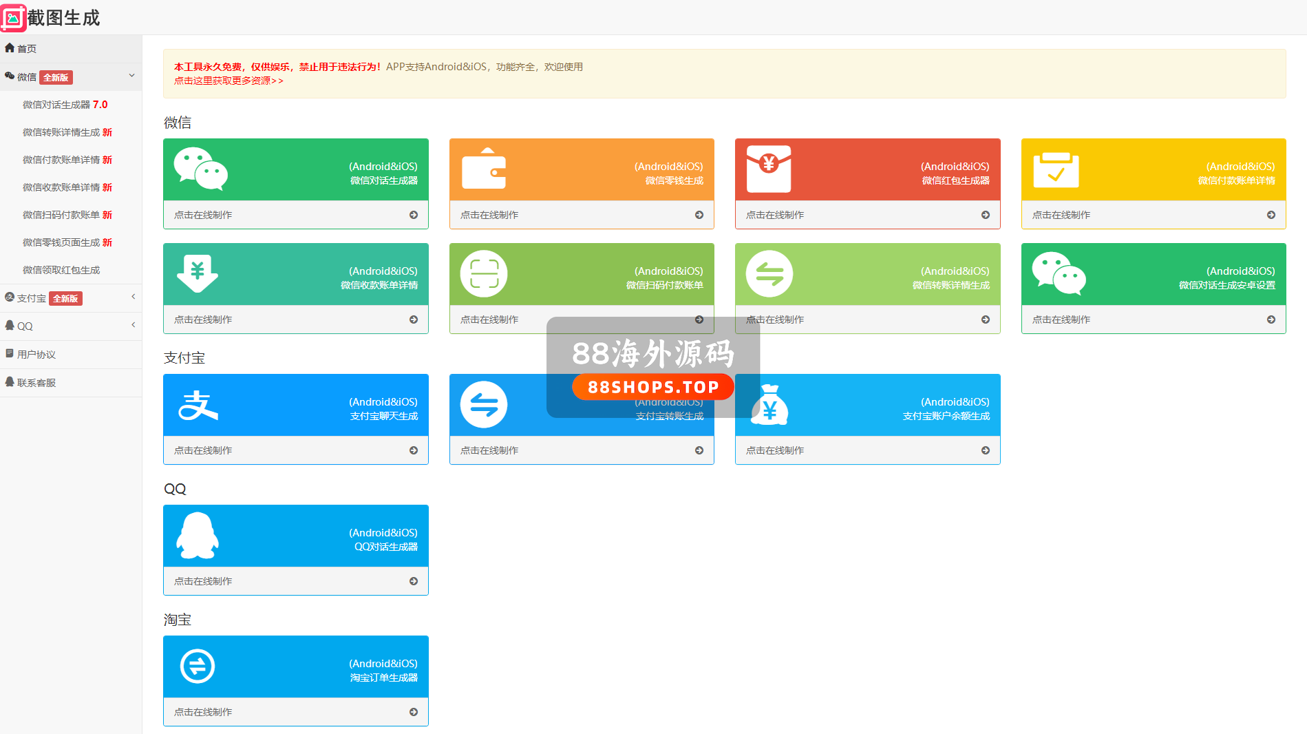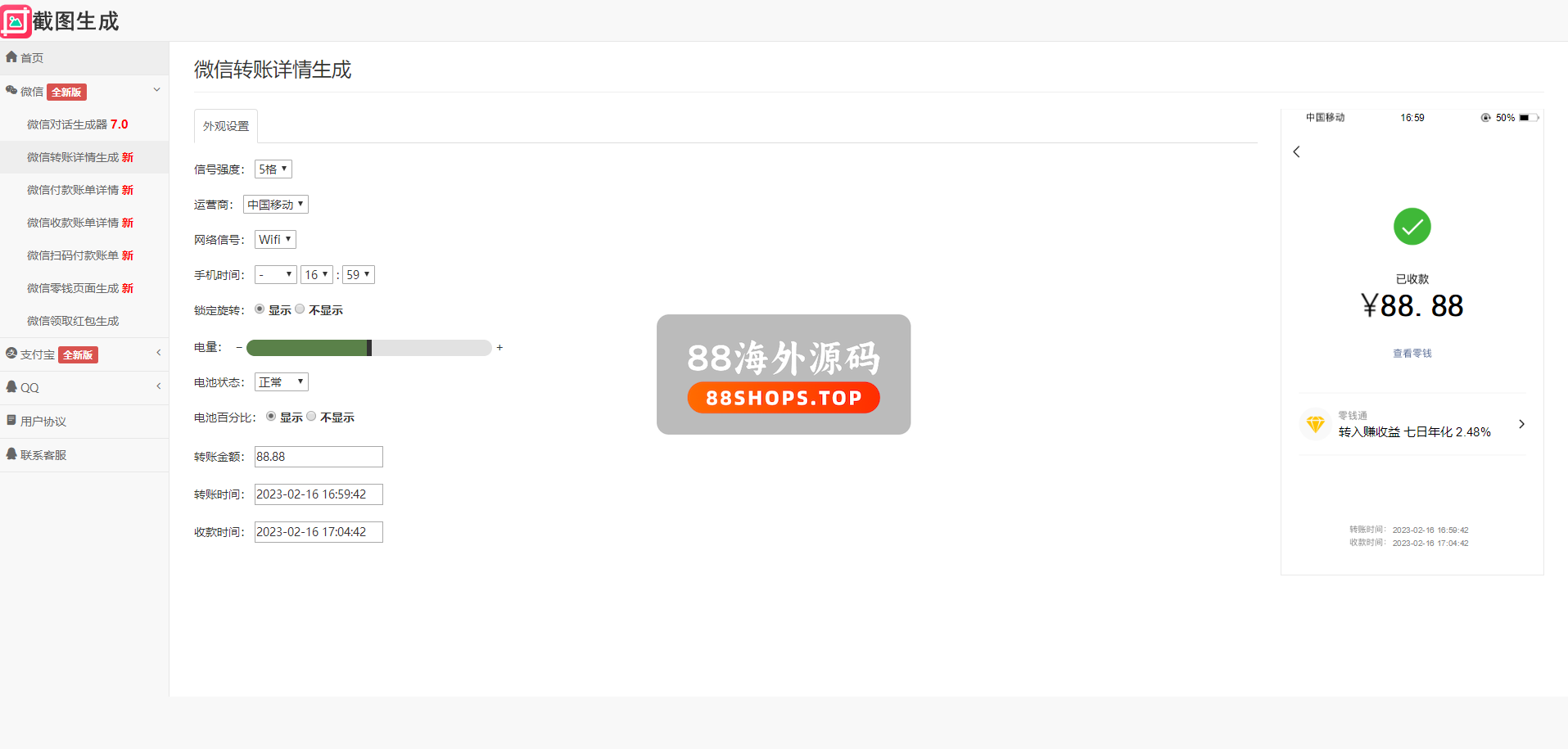 在线一键制作各种截图生成,包含生成功能:微信对话、微信领取红包、微信付款详情、微信收款详情、微信转账详情、微信零钱页面详情、微信扫码付款账单、微信对话和红包带安卓设置、微信朋友圈转发详情、支付宝聊天详情、支付宝转账详情、支付宝账户余额详情、淘宝订单详情、QQ聊天详情、手机短信聊天详情!