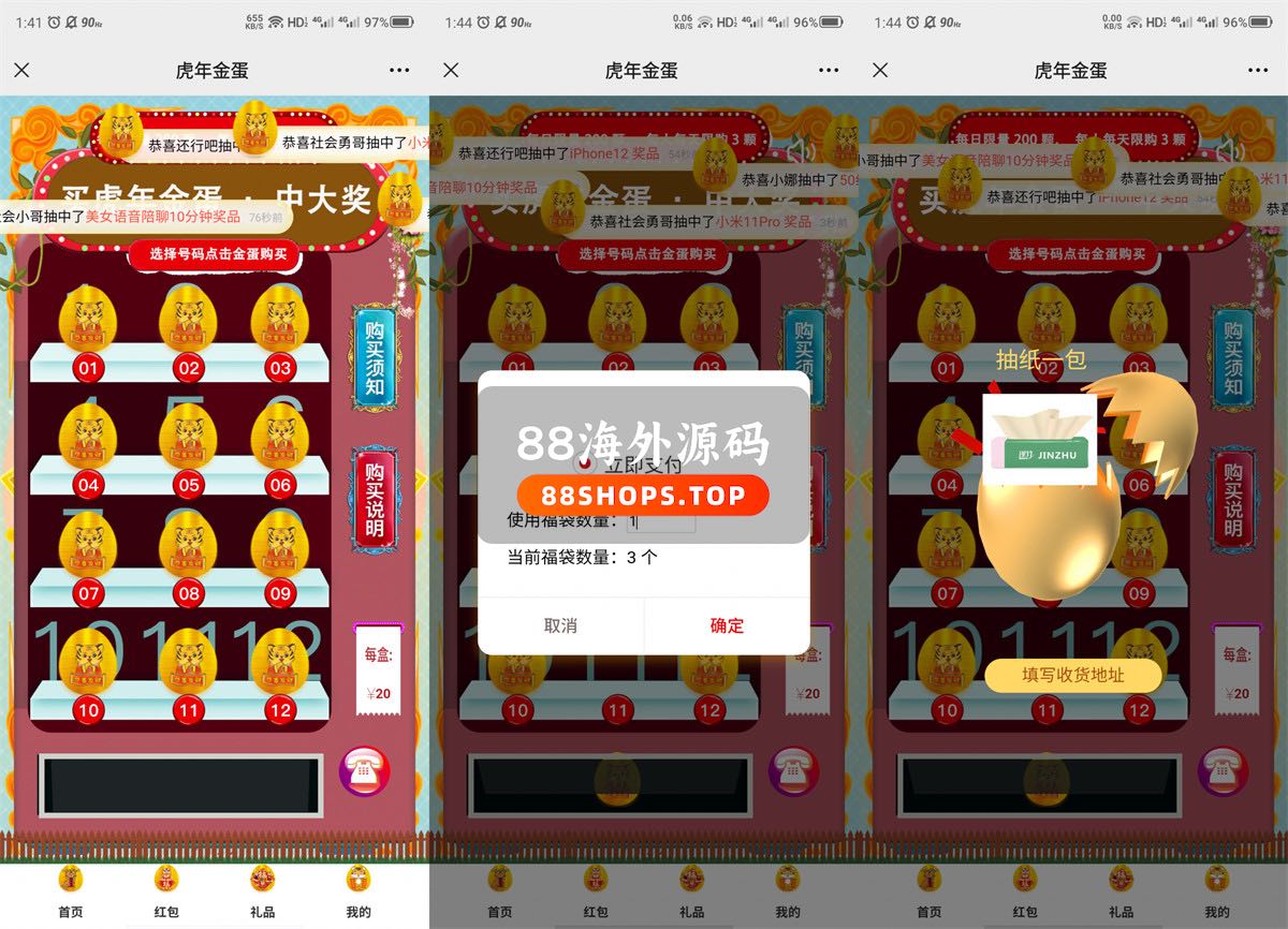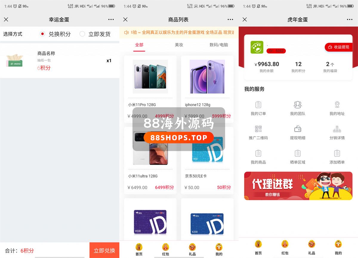 最近很多人在找的虎年砸金蛋的源码,和礼物盲盒差不多,改成了砸金蛋的模式,自带积分商城,可发货可兑换积分。