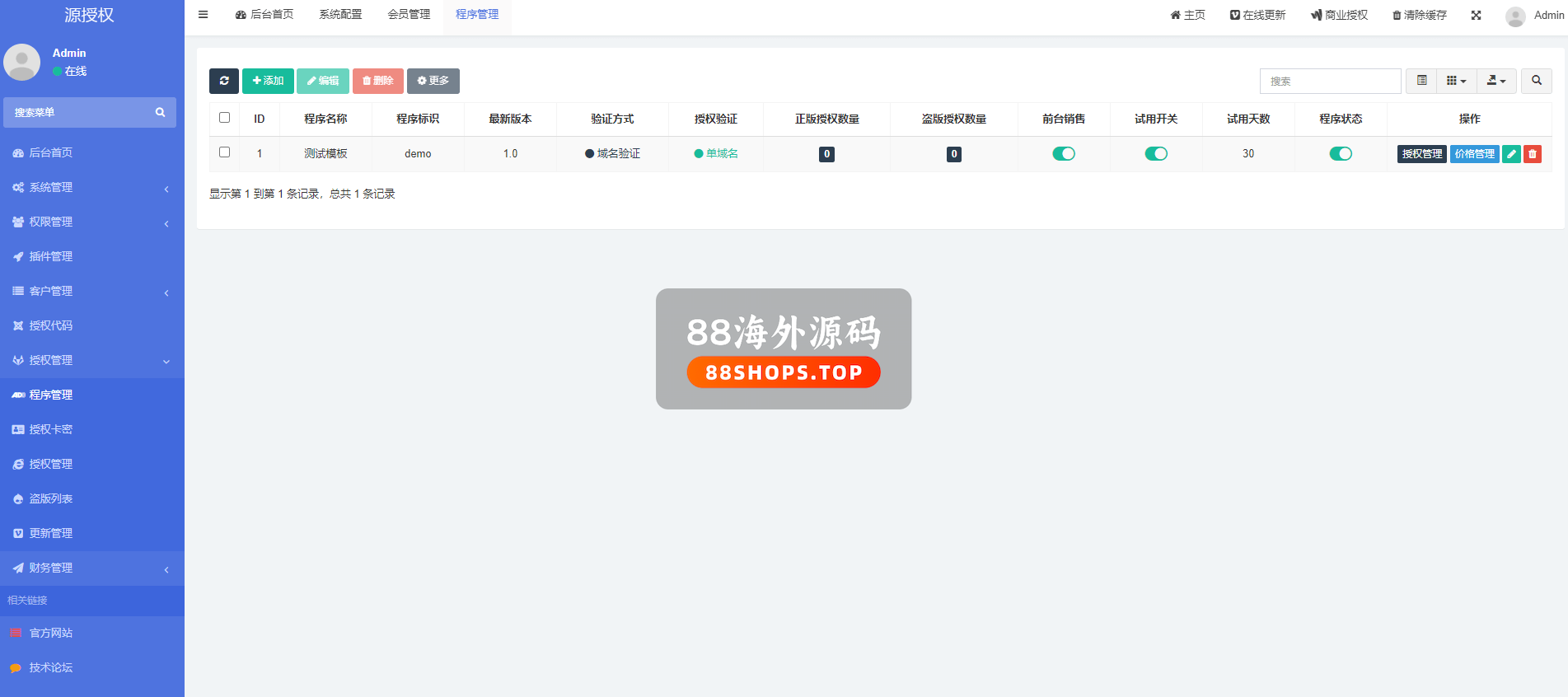 源授权是一款全新架构的授权系统.采用ThinkPHP 5.0开发,内置各种强大的功能,邮件管理,腾讯云短信、阿里云短信等.后台强大简洁,使用方便快捷,支付模块集成易支付功能,前台支持自助购买和操作管理授权! 搭建一个网站的标配包括了服务器和域名 (源授权不支持虚拟主机)强烈建议使用:[服务器](标准版、系统选Centos、其他配置默认即可后续可升级配置),刚入门选择最低配置或者活动机器均可。 服务器环境要求的配置:PHP 7.2+ 和 Mysql 5.6(推荐使用linux版本宝塔进行管理搭建,完美) 支付接口集成了易支付 前台可使用卡密授权激活 支持多程序在线自助授权 短信集成腾讯/阿里云短信 支持前台在线充值支付购买 快捷登录方式集成了QQ/微信/微博 可自行对管理权限进行补差价升级 安全 稳定 简约 新UI · 告别繁琐操作 多端授权 · 一站多控 · 授权统一管理方便快捷