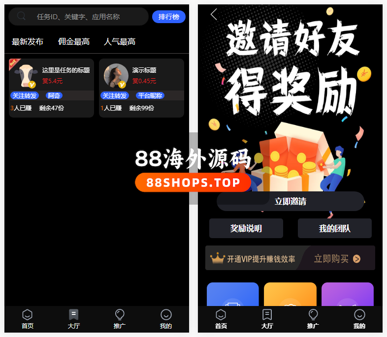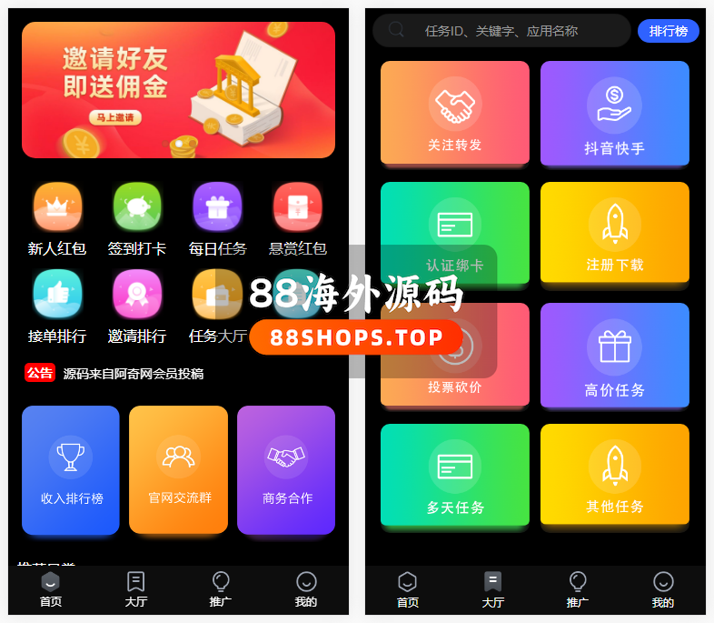 6、支持轮播图、公告、任务搜索、按人气、佣金、时间搜索等。