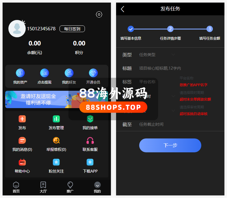 1、支持用户发布任务、置顶任务、发布任务红包、浏览任务、下架任务、分享任务、管理任务、暂停任务、任务加量、结束任务等