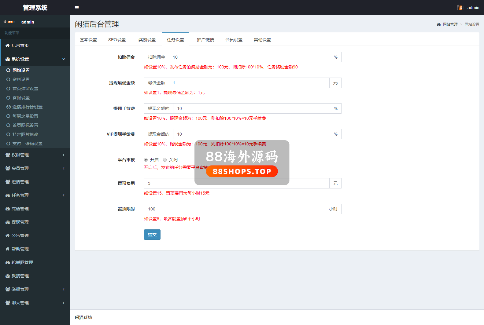 5、后台添加任务分类,可设置分类图片、发布任务的最低金额、会员领取任务的等级。