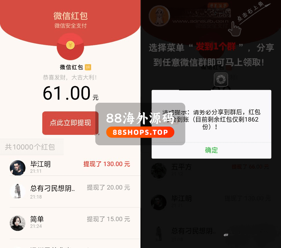 这款系统源码拥有多种分享机制,别人需要分享到微信群和朋友圈,而且必须分享。