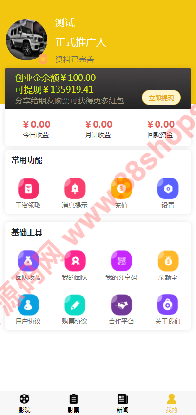 1、登录注册,充值提现,邀请好友,查看团队以及收益