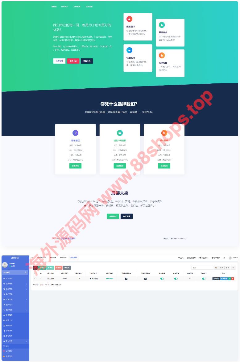 源授权是一款全新架构的授权系统.采用thinkphp 5.0开发,内置各种强大的功能,邮件管理,腾讯云短信、阿里云短信等.后台强大简洁,使用方便快捷,支付模块集成易支付功能,前台支持自助购买和操作管理授权!