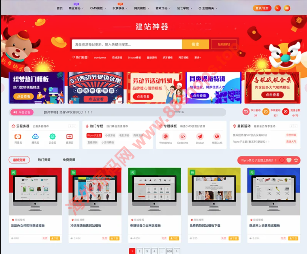 新增顶部加载条、Logo玻璃流光、登陆按钮下拉广告条、底部悬浮登陆/注册条、左下角悬浮活动图标、首页下载弹幕、内页波浪灯的设置(后台自由编辑)