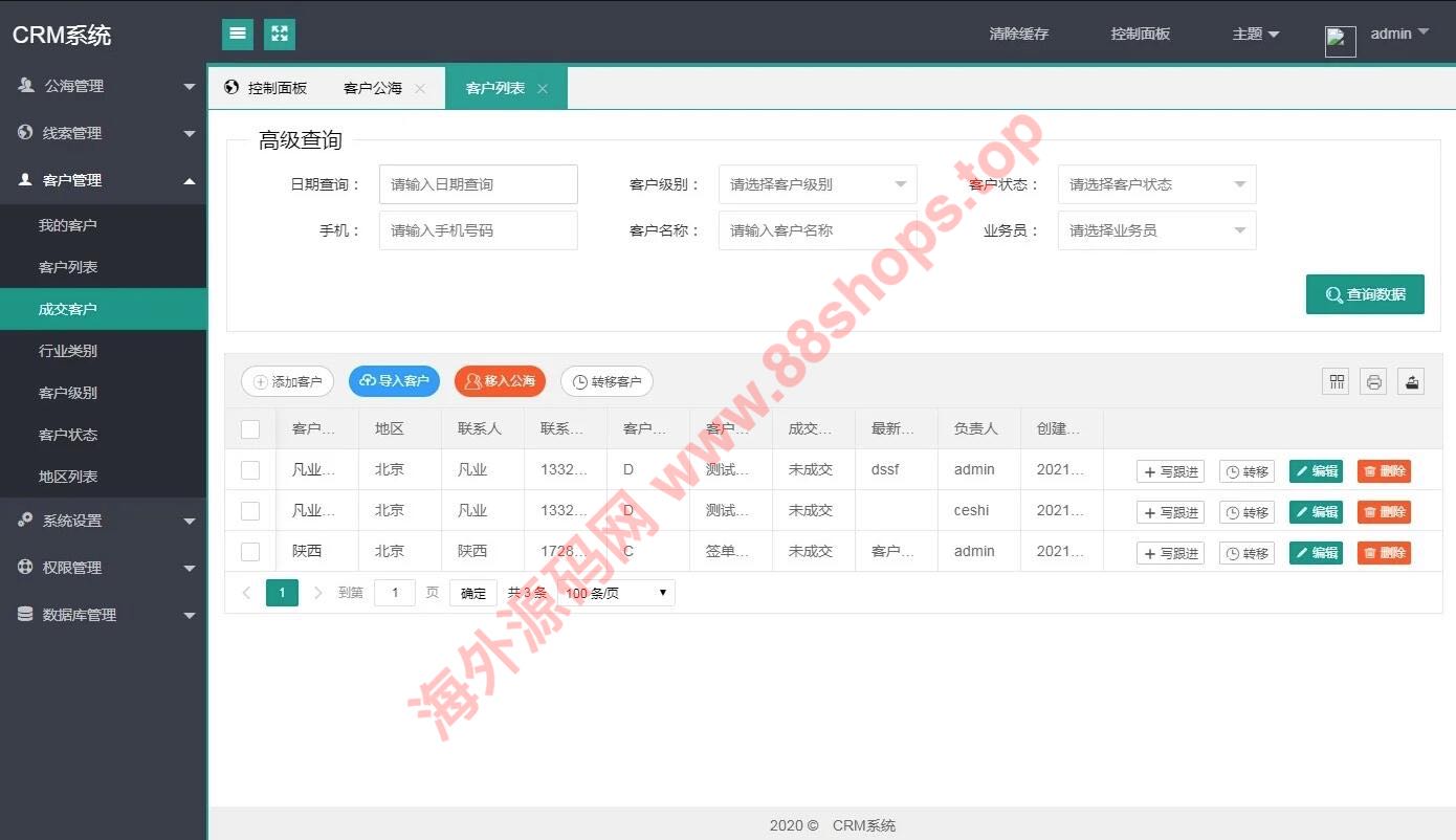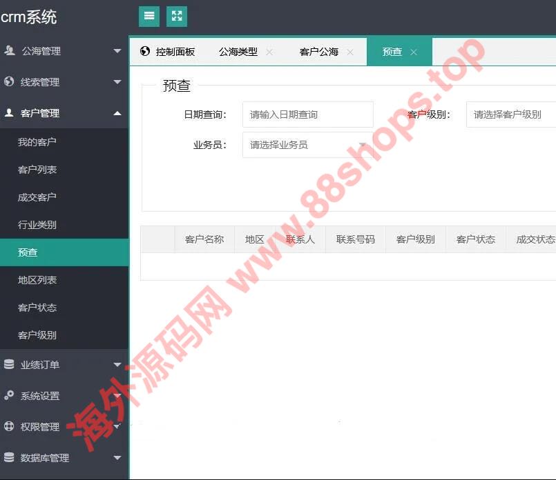 3、 客户管理:我的客户、客户列表、成交客户、行业类别、预查、地区列表、客户状态、客户级别。