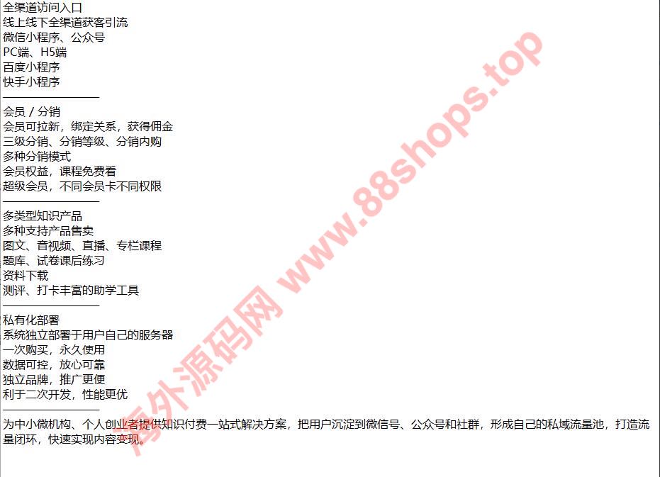 为中小微机构、个人创业者提供知识付费- -站式解决方案,把用户沉淀到微信号、公众号和社群,形成自己的私域流量池,打造流