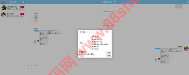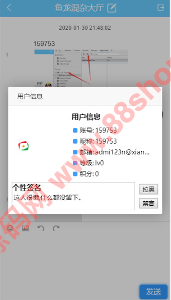 程序前台与后台自适应PC与移动端,支持一对多交流,可以自由创建新的房间与解散创建的房间,集成签到功能,等级功能,房间创建者可以对用户进行禁言、拉黑处理,房间可以由房间创建者自由设置进入密码,房间内支持 常规的文字消息、表情、支持自定义图片消息、图片可用本地或者图片外链。