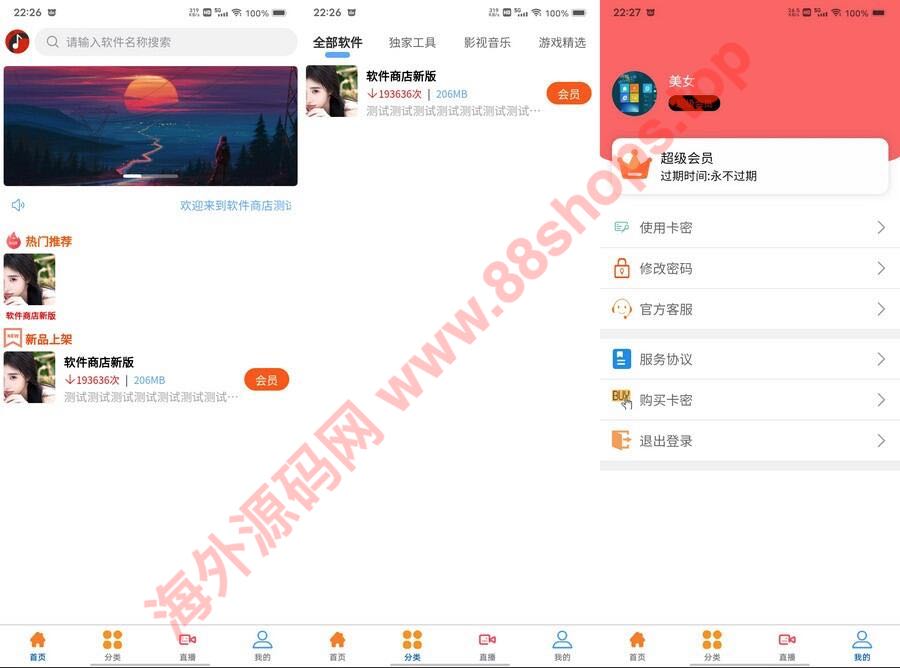 卡密会员登陆注册轮播图搜素功能分类功能直播盒子滚动通知维护功能基于uniapp+vk框架开发 此版本干净简洁无任何联系方式简洁免费服务器即可上线。