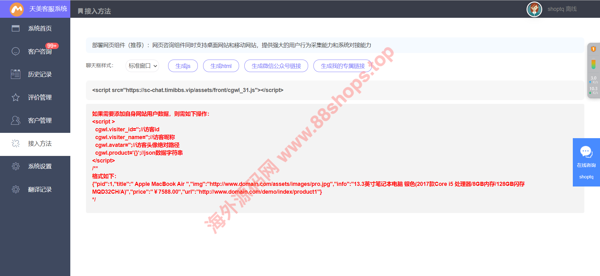 个人觉得还不错的是可以接入自己平台的用户信息,以往的客服系统要么是临时客户,要么必须得注册,但这套可以通过js接入你自己平台的客户信息,实现一对一绑定!